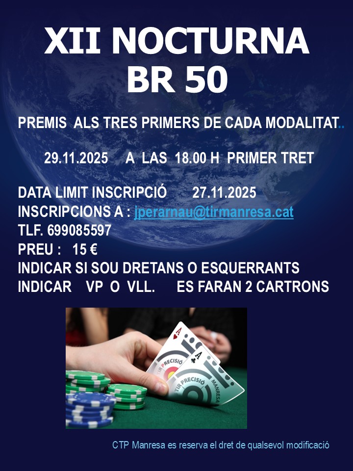 El Club Tir Precisió Manresa va acollir a les seves instal·lacions esportives, aquest cap de setmana, el Trofeu Generalitat de BR-50, en les modalitats de varmint pesat, lleuger i Sporter, en categoria única, organitzat per la Federació Catalana de Tir Olímpic en el qual hi van participar 38 tiradors.